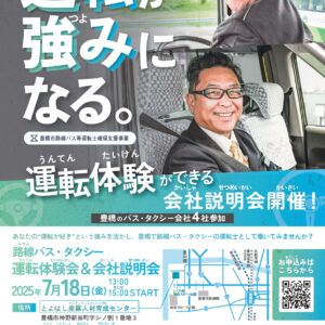 豊橋市では求職者のみなさんを対象に、正社員の運転士として長く安心して働くイメージが持てるよう、バス・タクシーを実際に運転できる体験会や会社説明会を開催します。