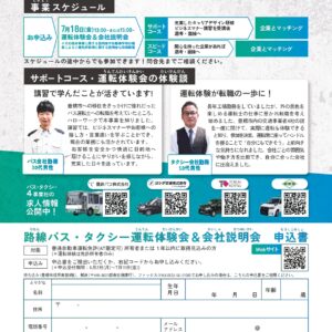 参加者には、キャリアデザイン研修やビジネスマナー講習を受講したのちに市内交通事業者の面接を受けられる手厚いサポートコースも用意しています。各社、入社後は二種免許取得の支援制度もありますので、未経験の方も安心してご参加ください!