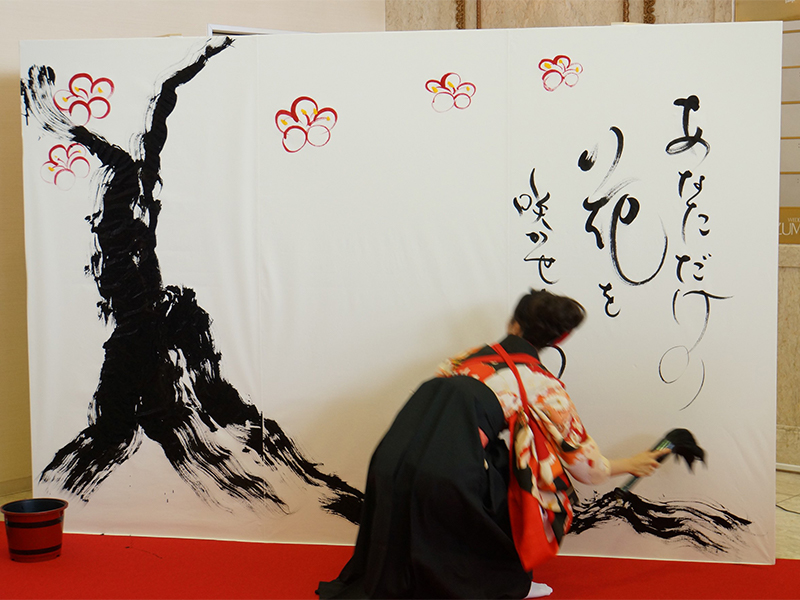 デザイン書道ライブパフォーマンスには鈴⽊愛さんのファンの⽅々など多くの⽅が訪れ、大筆を用いた圧巻のパフォーマンスを披露して下さいました。