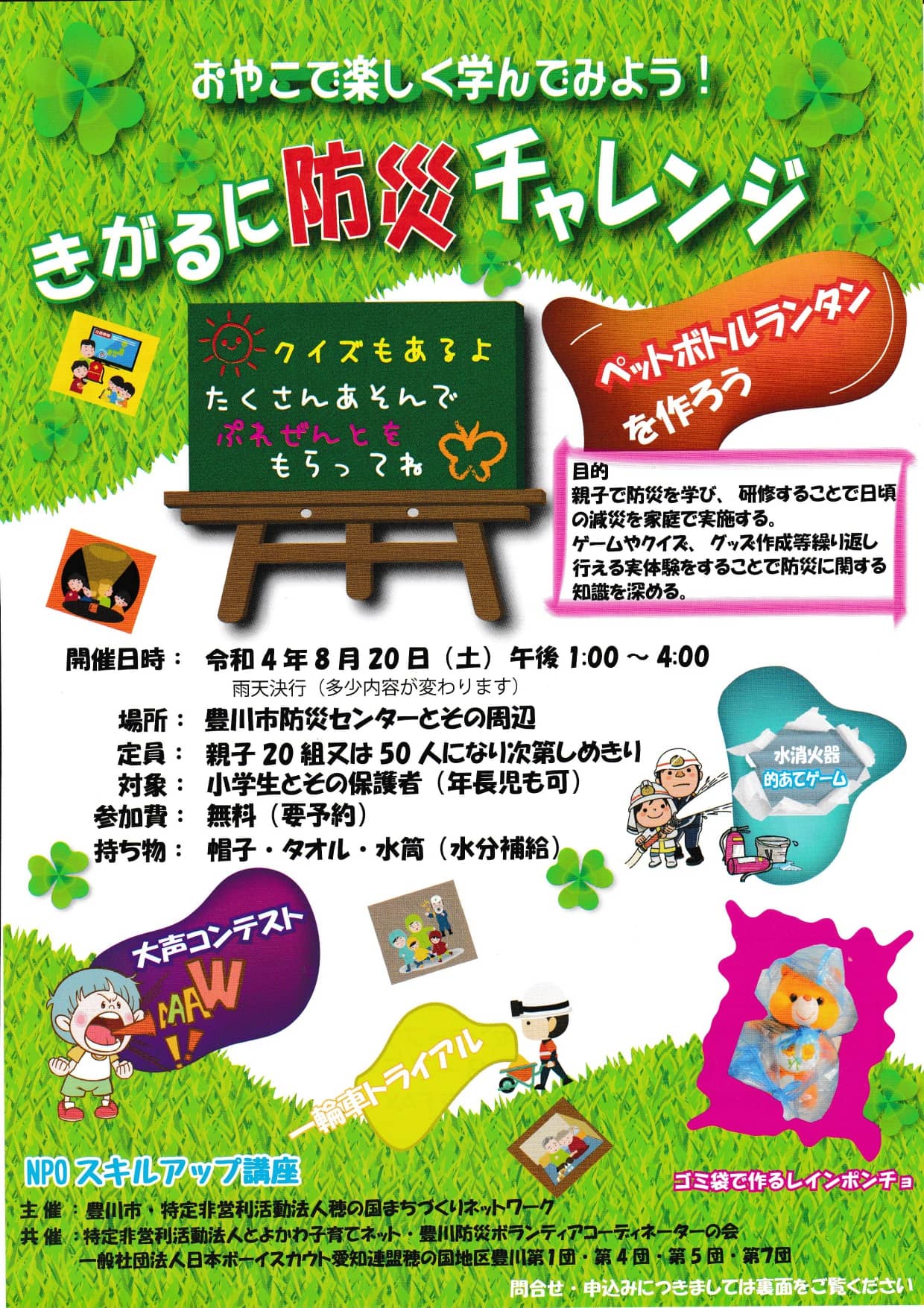 ペットボトルランタン作り、水消火器的あてゲーム、ゴミ袋で作るレインポンチョ作りなどがあります。