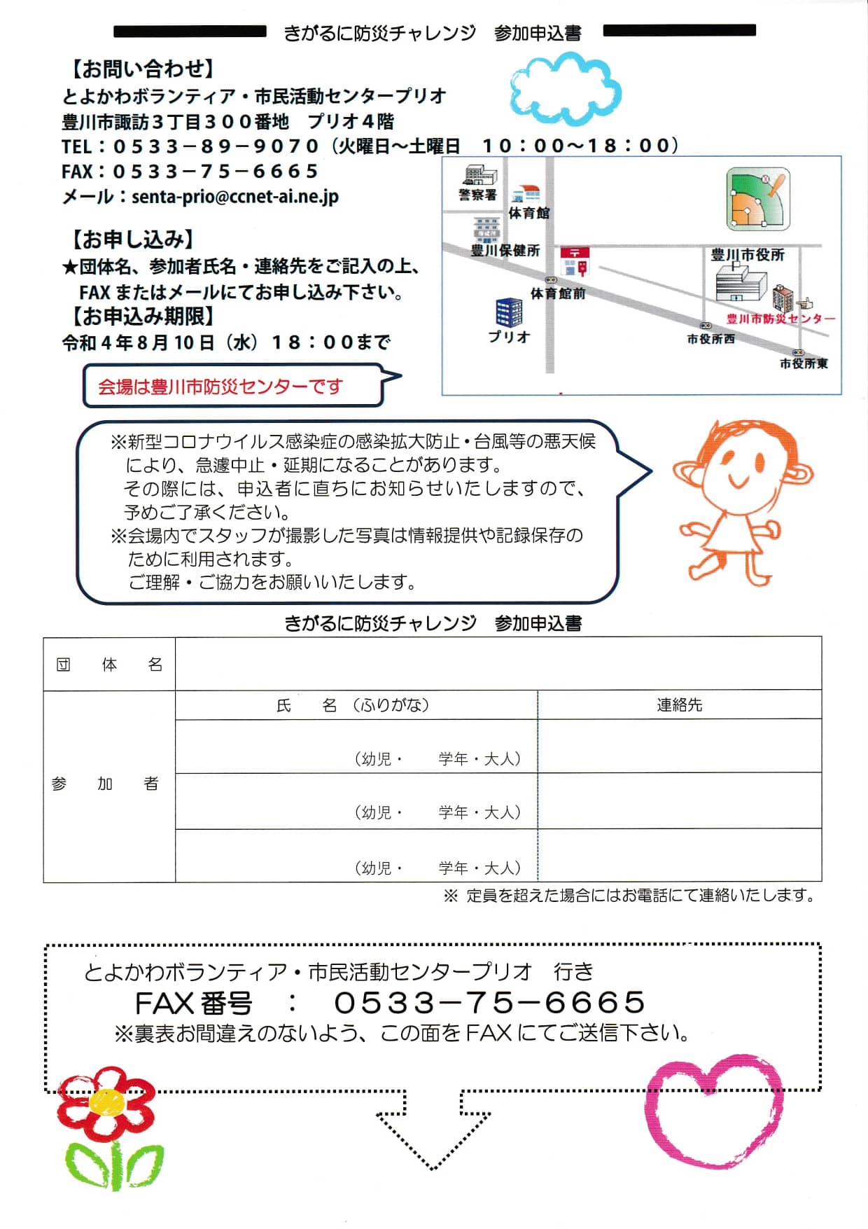| 申込方法 | 団体名、参加者氏名・連絡先をご記入の上、FAXまたはメールにてお申し込み下さい。 お申し込み期限 2022年8月10日(水)18:00まで |
