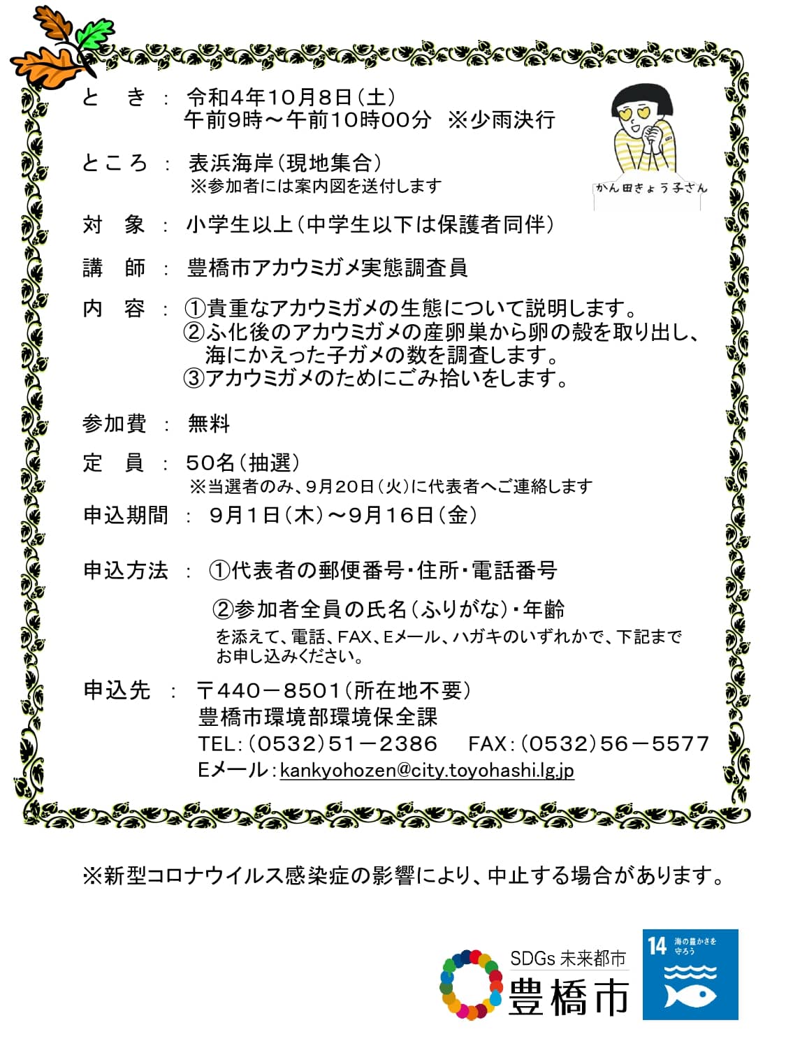 | 応募方法 | 2022年9月1日(木)~9月16日(金)までに (1)代表者の郵便番号、住所、電話番号 (2)参加者全員の氏名(ふりがな)、年齢 を添えて、電話、FAX、Eメール、ハガキのいずれかで、下記までお申し込みください。 〒440-8501(所在地不要) 豊橋市役所環境保全課 電話:(0532)51-2386 FAX:(0532)56-5577 Eメール:kankyohozen@city.toyohashi.lg.jp |