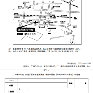 | お問い合わせ | 蒲郡市役所 生涯学習課生涯学習担当 Tel:0533-66-1167 Fax:0533-66-1199 |