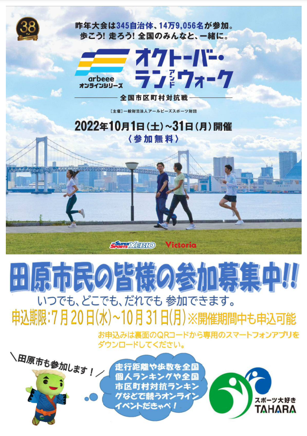 走行・歩行距離を全国個人ランキングや全国市区町村対抗ランキングなどの様々なランキングで競うオンラインイベント「オクトーバー・ランアンドウォーク2022」の参加者を募集します。