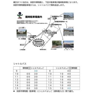 - 当日は、近隣の臨時駐車場、田原市博物館駐車場(シャトルバスあり)をご利用ください