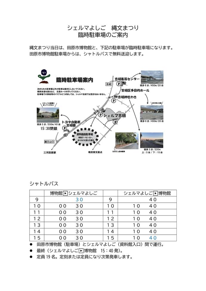 - 当日は、近隣の臨時駐車場、田原市博物館駐車場(シャトルバスあり)をご利用ください