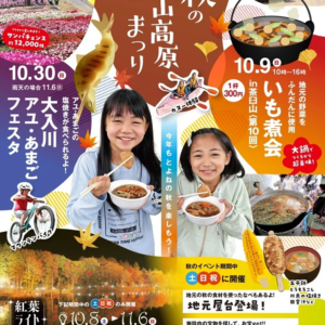 「いも煮会」をはじめ、露店販売など豊かな自然の中でおもいっきり楽しめるイベントを茶臼山で行います。また、紅葉は10月下旬から11月上旬で愛知県で一番早く紅葉が始まります。