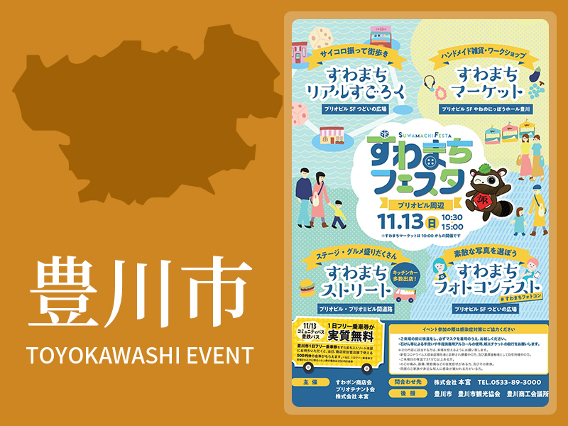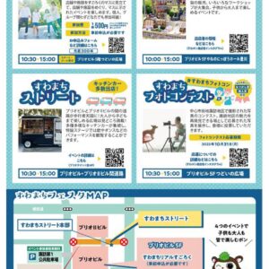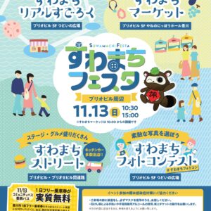 2022年11月13日(日)に諏訪地区において、すわまちフェスタを開催予定です。大人から子どもまで楽しめるイベントになっておりますので、是非足を運んでみてください。