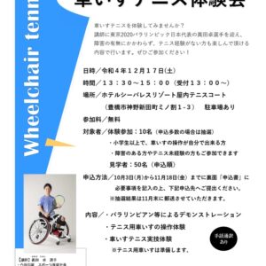 講師に東京2020パラリンピック日本代表の眞田卓選手を迎え、障害の有無にかかわらず、テニス経験がない方も楽しんで頂ける内容で行います。