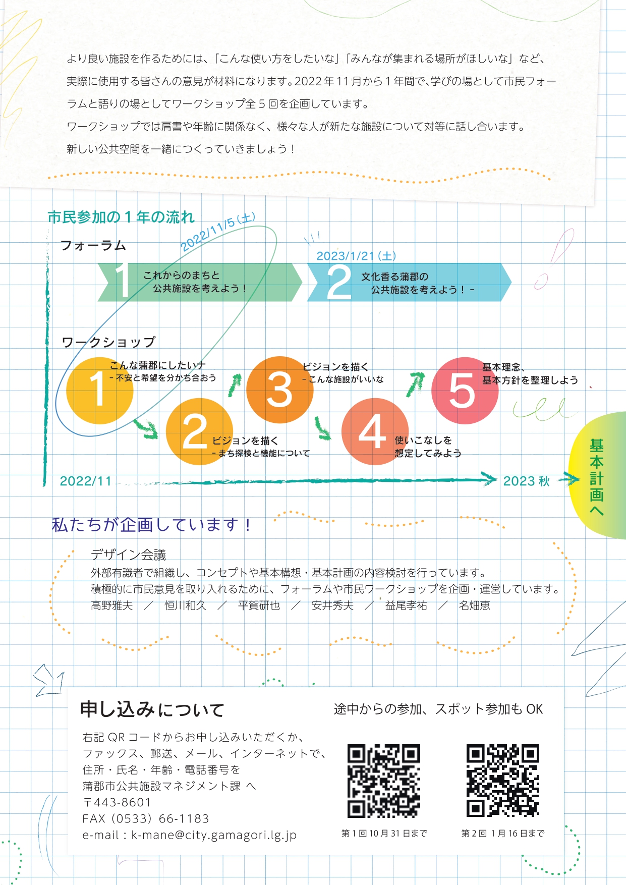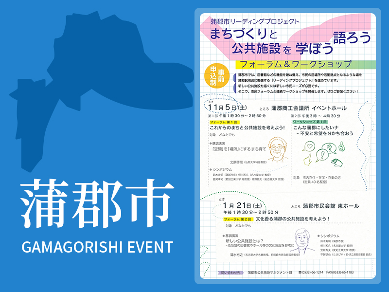 | 申込方法 | インターネット:以下のフォームよりお申込みください【申込みフォーム】 メール:住所・氏名・年齢・電話番号にタイトル「公共施設ワークショップ参加希望」と記載(送付先:k-mane@city.gamagori.lg.jp) ファクス:住所・氏名・年齢・電話番号、「公共施設ワークショップ参加希望」と記載(送付先:FAX0533-66-1183) 申込期限 2023年1月16日(月) |