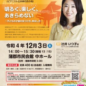 世界的なピアニスト、辻井伸行氏の母である辻井いつ子氏を講師にお迎えし、息子の可能性を信じ、その才能を引き伸ばすことに注力した、ご自身の経験等を語っていただきます。