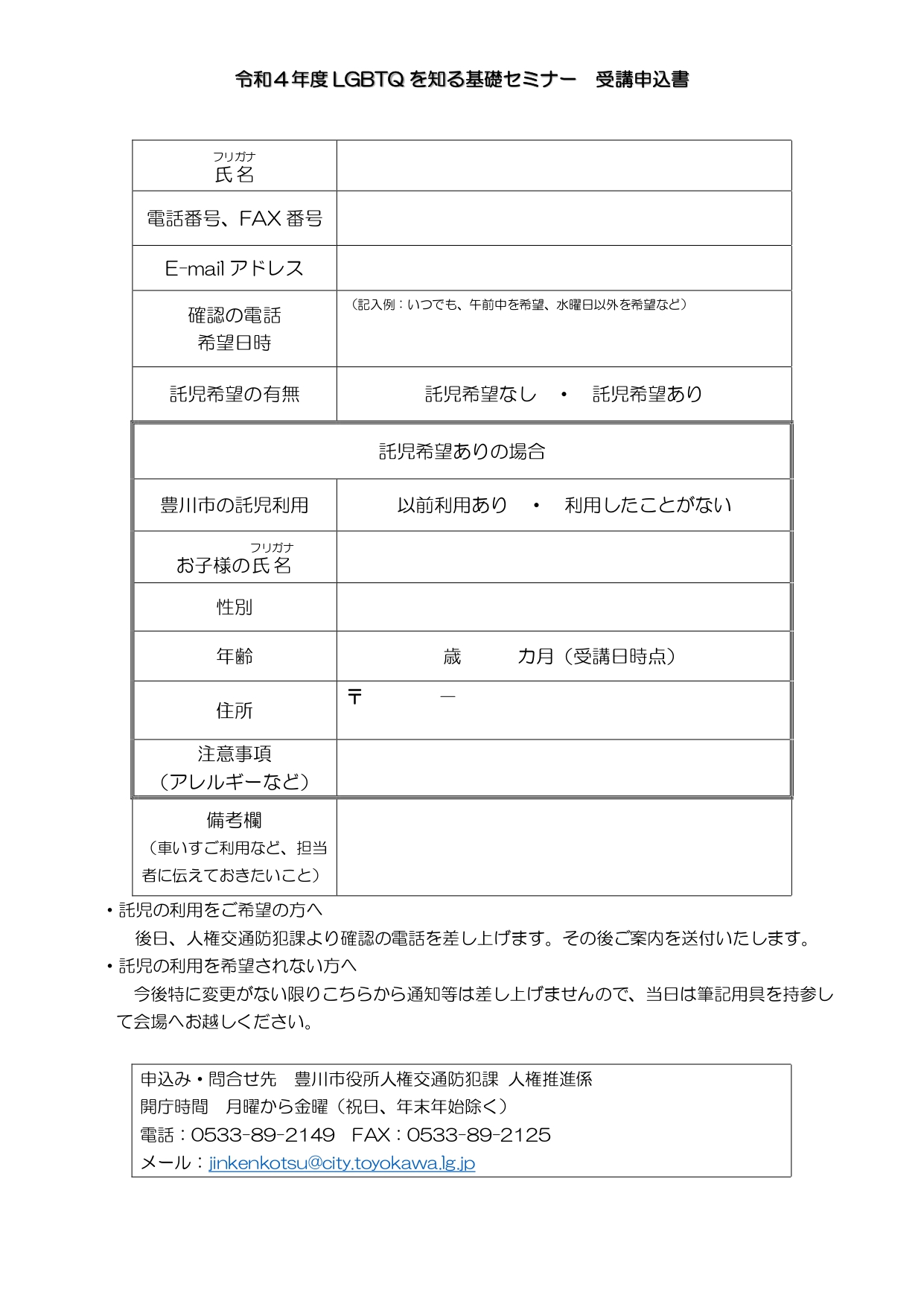| お問い合わせ | 豊川市役所 人権交通防犯課 人権推進係 電話:0533-89-2149 FAX:0533-89-2125 メール:jinkenkotsu@city.toyokawa.lg.jp |