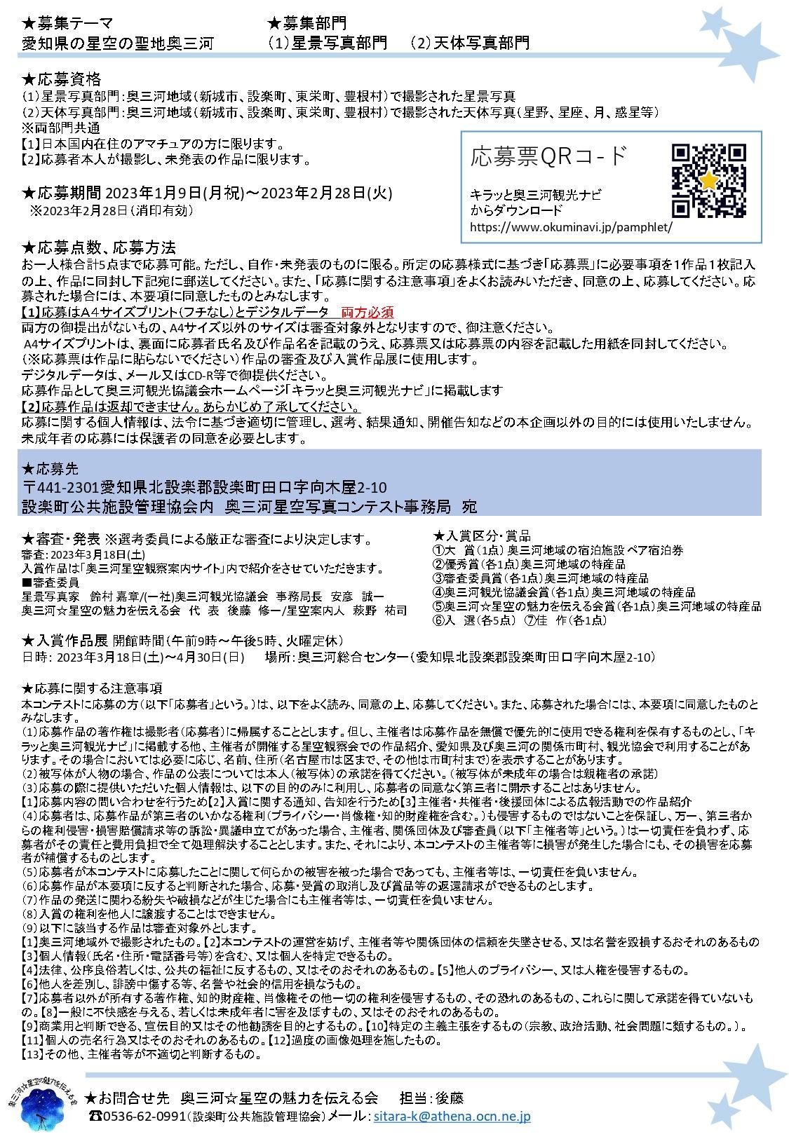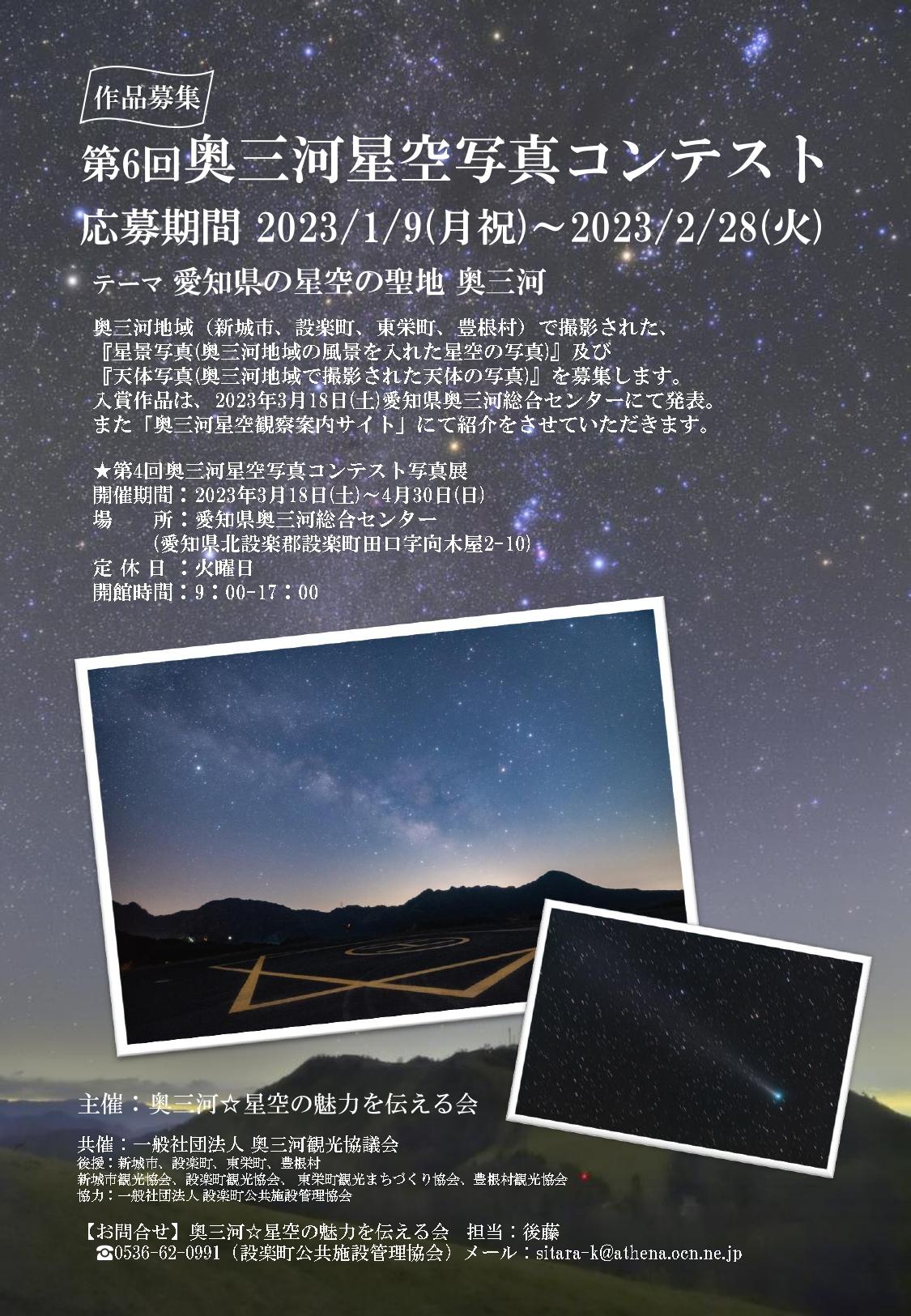 | お問い合わせ | 奥三河☆星空の魅力を伝える会 担当:後藤 電話:0536-62-0991(設楽町公共施設管理協会) メール:sitara-k@athena.ocn.ne.jp |