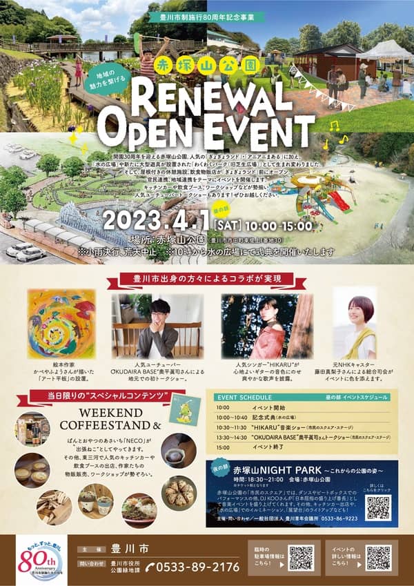 2023年4月1日(土)豊川市制施行80周年記念事業 赤塚山公園リニューアルオープンイベントは、昼の部と夜の部の2部構成となっています。