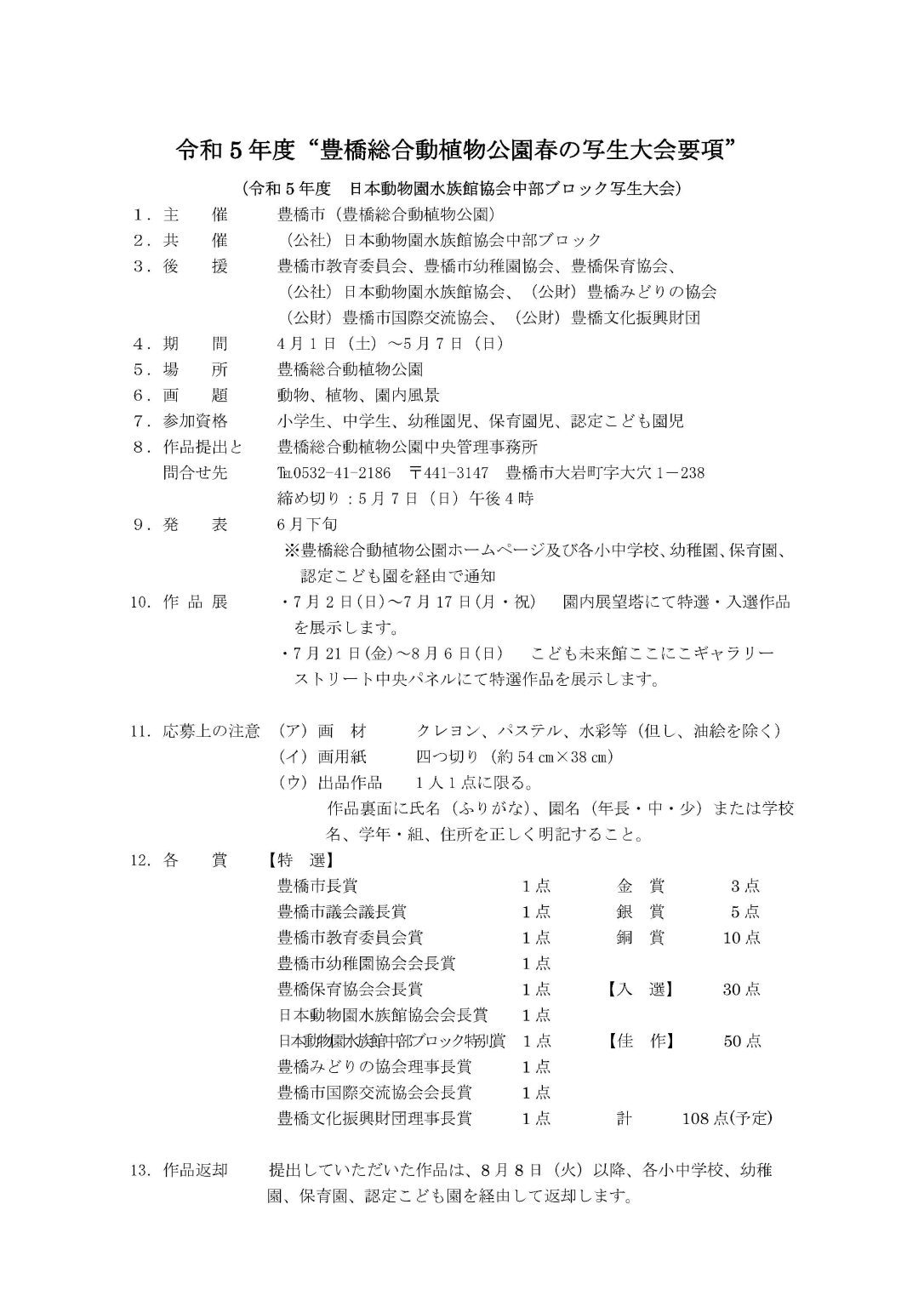 豊橋総合動植物公園では、幼稚園・保育園・認定こども園児及び小中学校の児童生徒を対象に、動物観察や植物を観賞することにより動植物の愛護精神を高め、教育並びに文化の向上を図るため、毎年写生大会を開催しています。