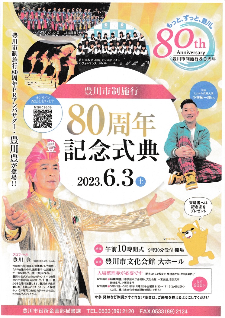 豊川市公式YouTubeチャンネルで公開中の市制80周年記念ソング「豊川、豊か」を会場で披露します。