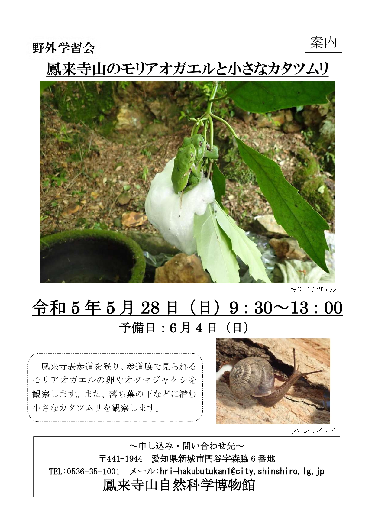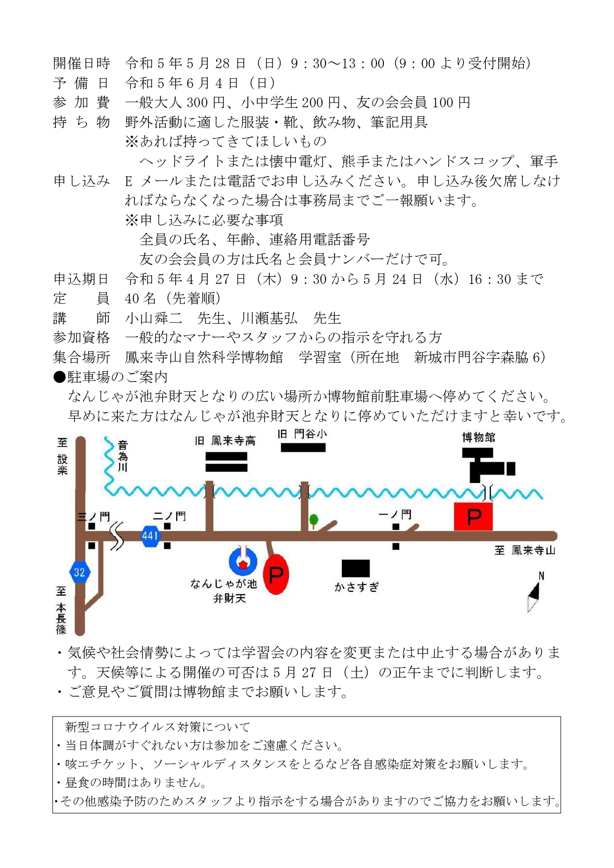 | 集合場所 | 鳳来寺山自然科学博物館 学習室 (新城市門谷字森脇6番地) |