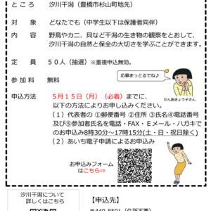 豊橋市と田原市にまたがる汐川干潟は、数多くの渡り鳥や貝、カニなどいろいろな生き物が共存しており、多くの方々に、この生き物の宝庫である汐川干潟の自然について学んでいただき、郷土の自然とその保全の大切さについて考えてもらうために、自然観察会を開催します。