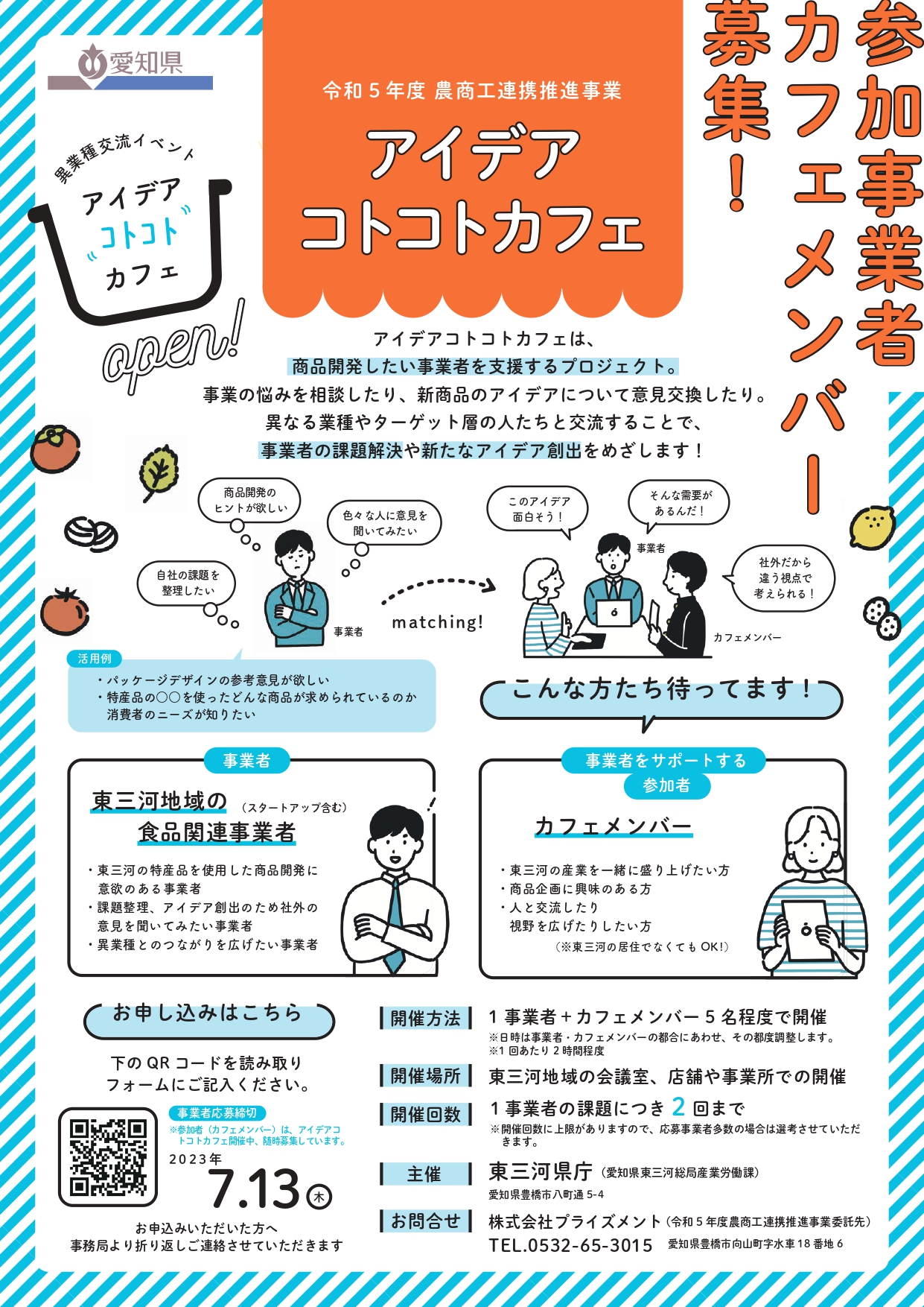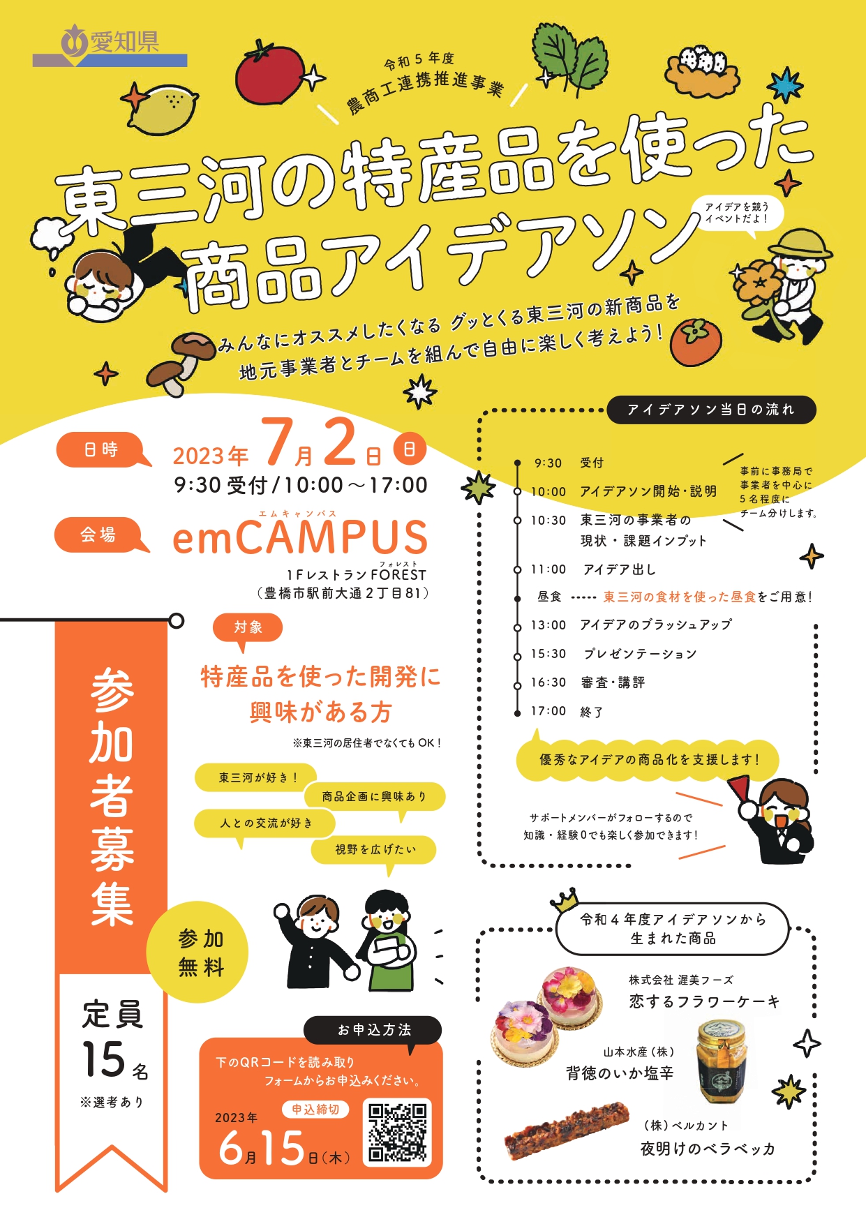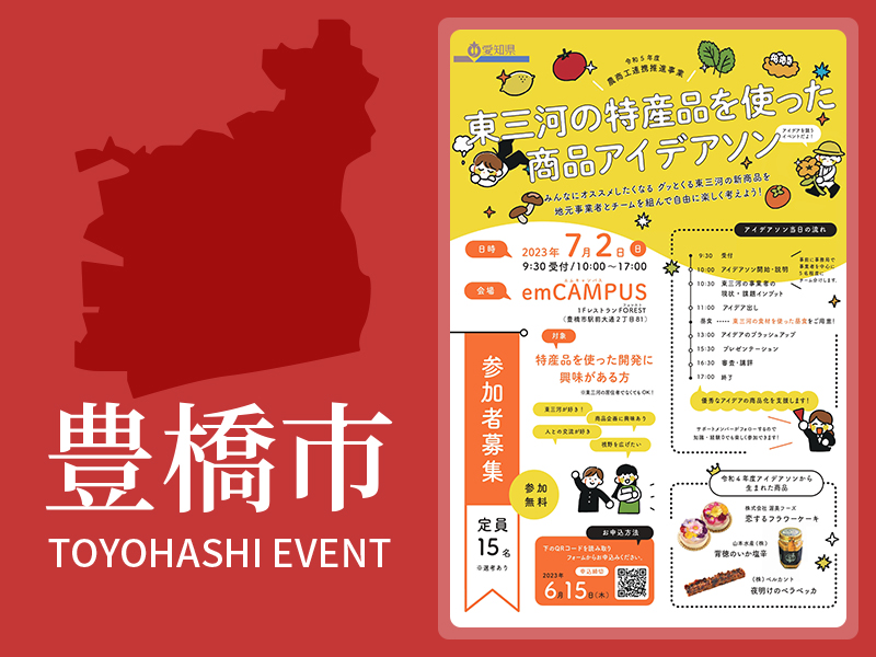 ■東三河の特産品を使った商品アイデアソン 2023年7月2日(日)10:00~17:00(9:00受付開始) ■アイデアコトコトカフェ 事業者・参加者の都合に合わせ、その都度調整 |