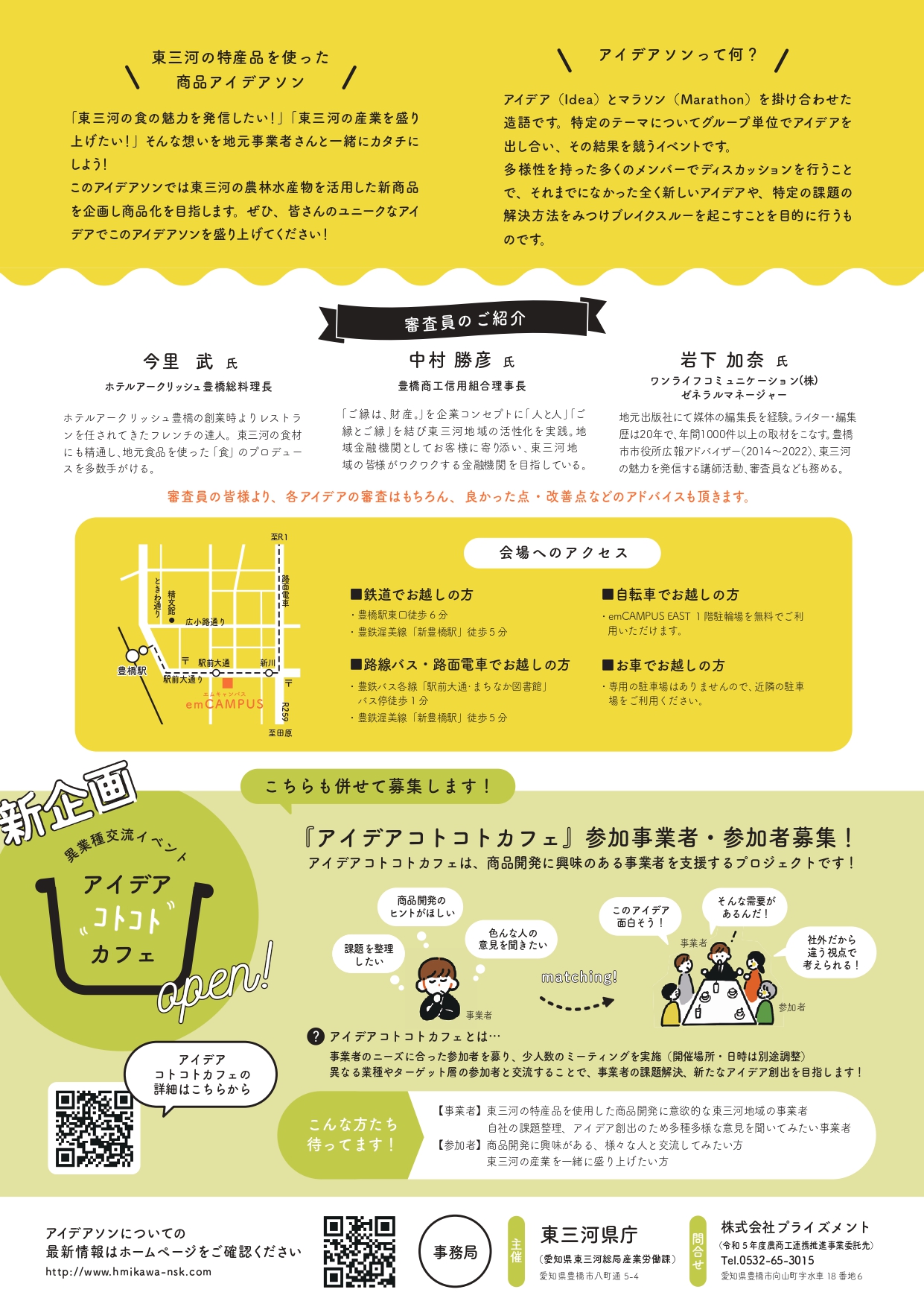 | 場所 | ■東三河の特産品を使った商品アイデアソン emCAMPUS(エムキャンパス) 1階 レストランFOREST(フォレスト) ■アイデアコトコトカフェ 東三河地域の会議室、店舗や事業所で開催 |