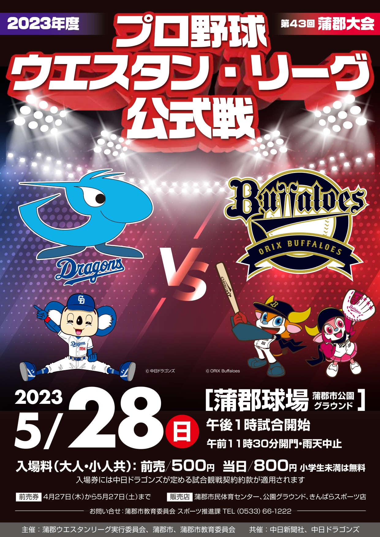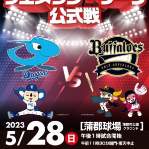 5月28日(日)に蒲郡球場で開催するウエスタン・リーグ公式戦「オリックス・バファローズ戦」の開催要項をお知らせいたします。