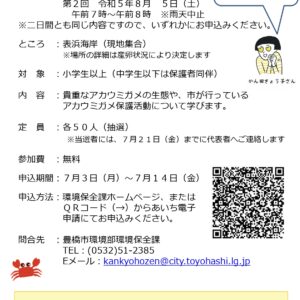 豊橋市の表浜海岸には、5月から7月にかけて絶滅危惧種であるアカウミガメが産卵に訪れます。この期間に合わせ、表浜海岸の豊かな自然を次世代に残す大切さについて考えていただくため、自然観察会を開催します。