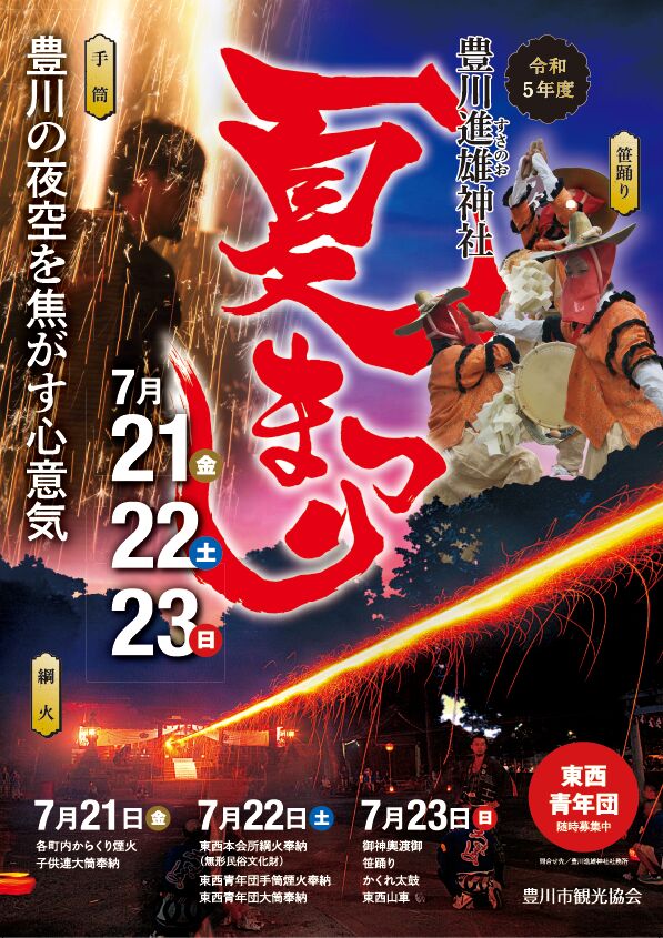 豊川西町の豊川進雄神社の祭礼で、手筒煙火・からくり煙火・山車・神輿渡御・笹踊りなどの行事が行われます。