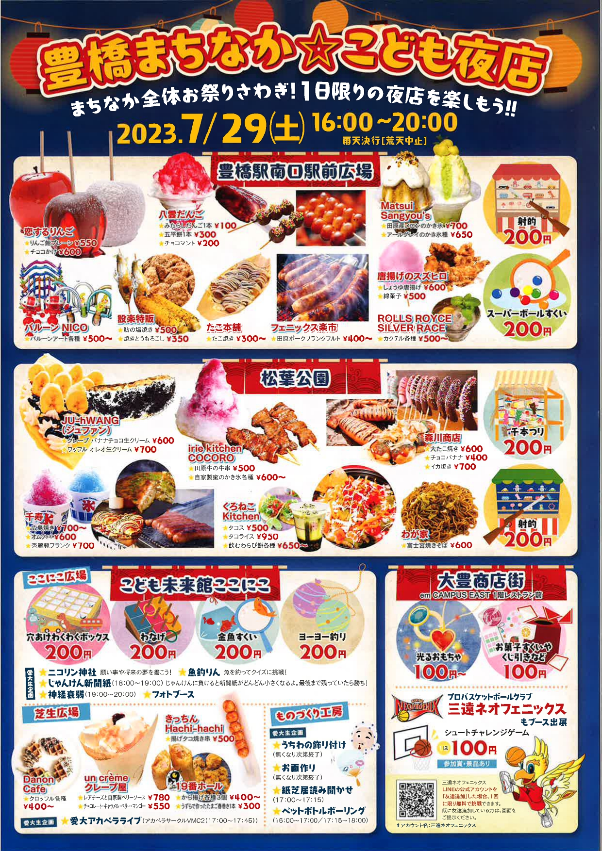まちなかの賑わいのため、地元商店街、愛知大学、三遠ネオフェニックス、松山校区と連携し、こども夜店を開催します。また、回遊性向上のため、新たに松葉公園を会場に追加し、各会場を巡るスタンプラリーも実施します。1日限りのこども夜店とスタンプラリーを楽しみながら、素敵な思い出を作りましょう。