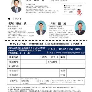 本セミナー終了後、セミナー会場では、豊橋市役所で開催する事業承継個別相談会の申込受付をいたしますので、ご希望の方はお申込みください。(個別相談会は随時、申込みが可能です。)