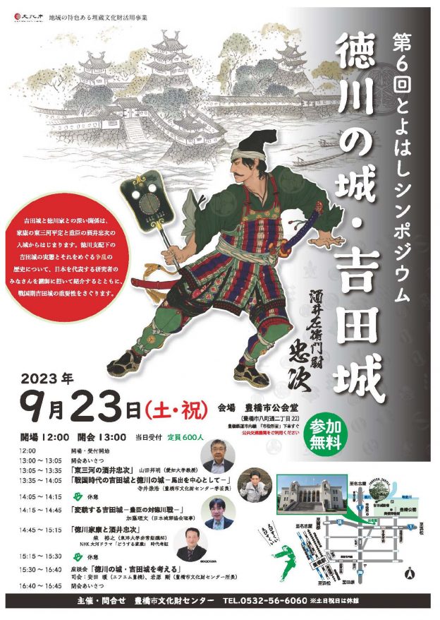 吉田城と徳川家との深い関係は、永禄8年(1565)の松平家康の東三河平定と重臣の酒井忠次の入城からはじまります。徳川支配下の吉田城の実態とそれをめぐる争乱、さらに城主だった酒井忠次の事績や実際の姿について、日本を代表する研究者を講師に招き紹介します 。