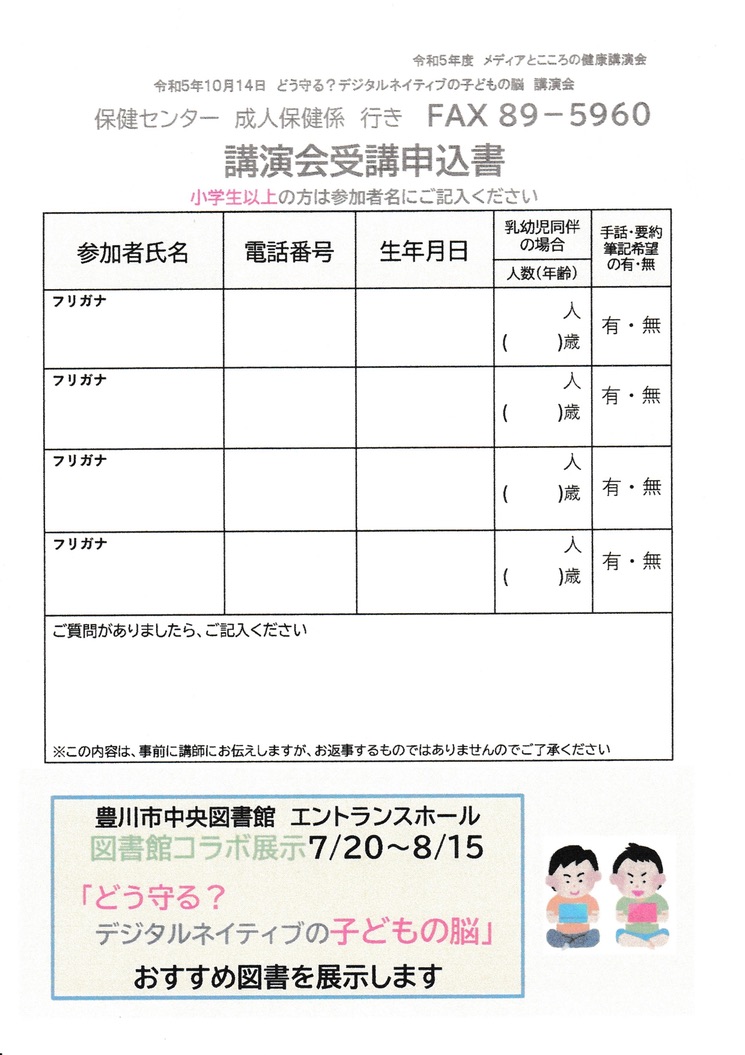 ◆FAXの場合は、小学生以上の方の氏名・電話番号・生年月日・講演会名(メディアとこころの健康講演会10月14日)を明記し送信してください。