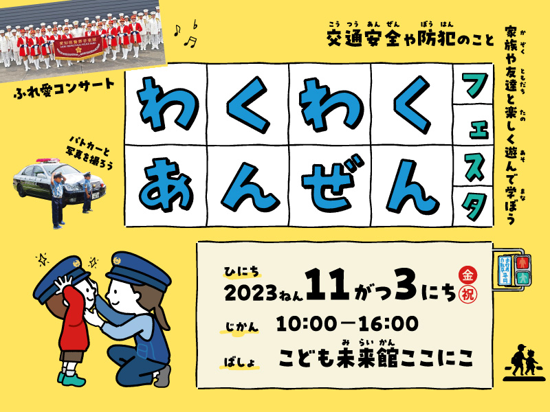 子どもたちや家族が安全・安心に生活できるよう、「交通安全・防犯」の大切さについて親子で学ぶことができるイベントを、こども未来館「ここにこ」で開催します。