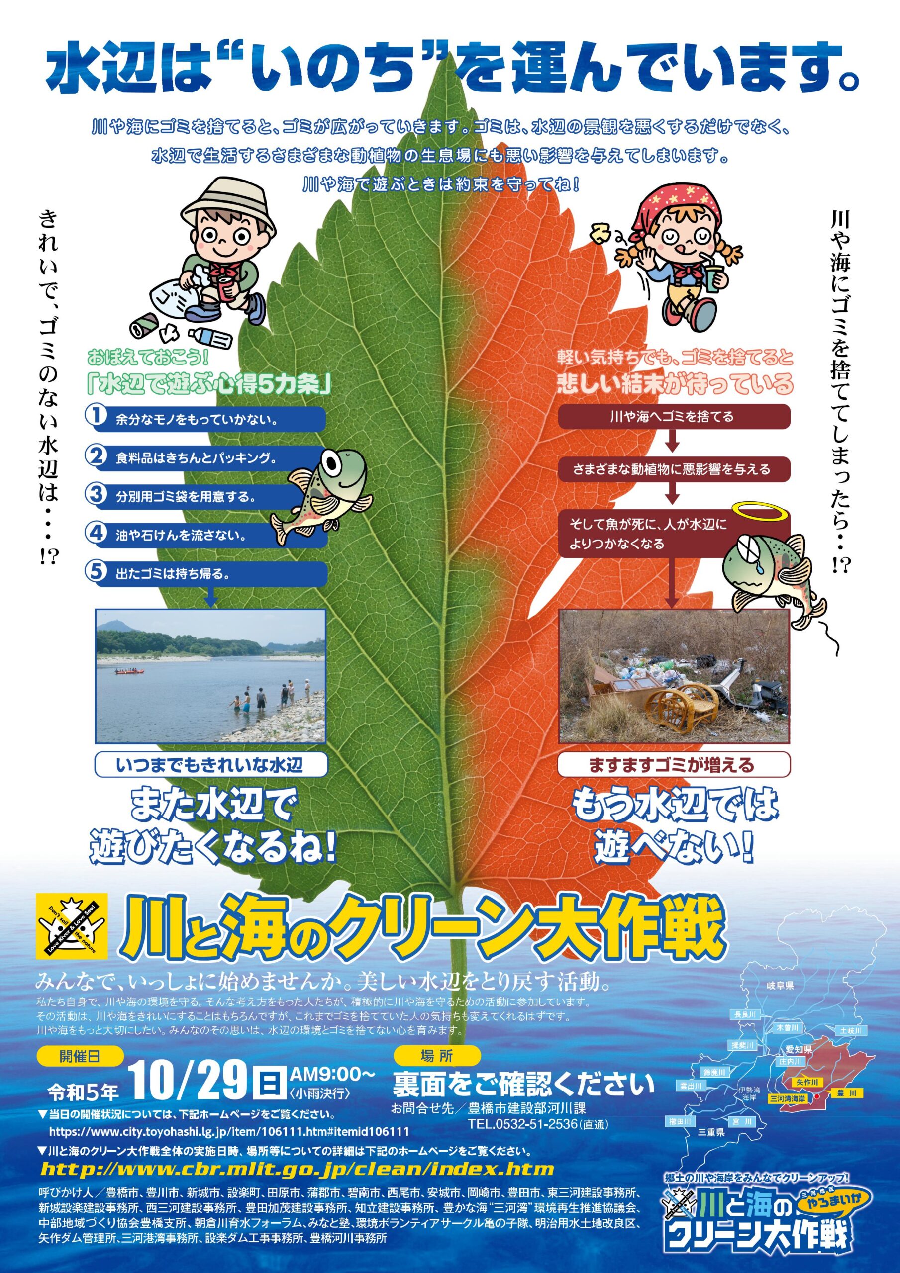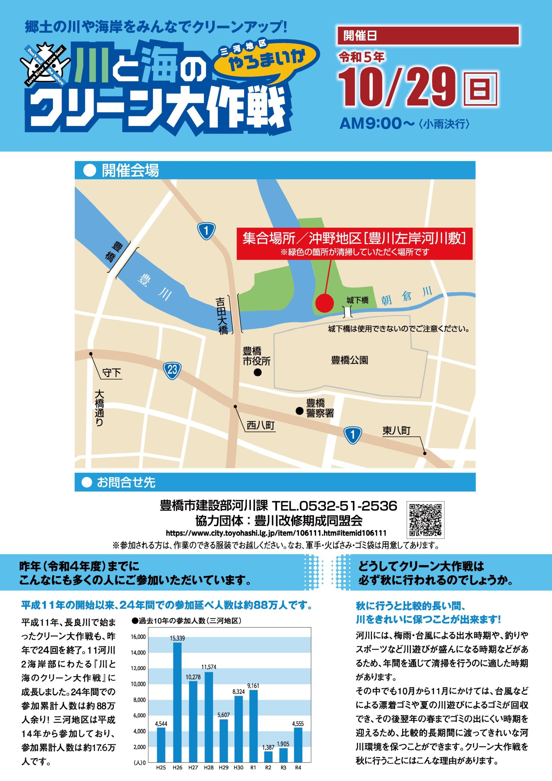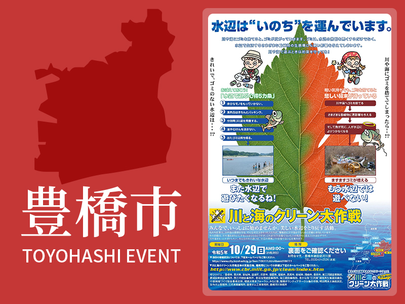 2023年10月29日「川と海のクリーン大作戦」を開催いたします。川と海のクリーン大作戦は平成11年に長良川で始まり、現在11河川2海岸部にわたり開催されています。豊川では平成14年から実施し、今年で22回目です。参加費無料です。