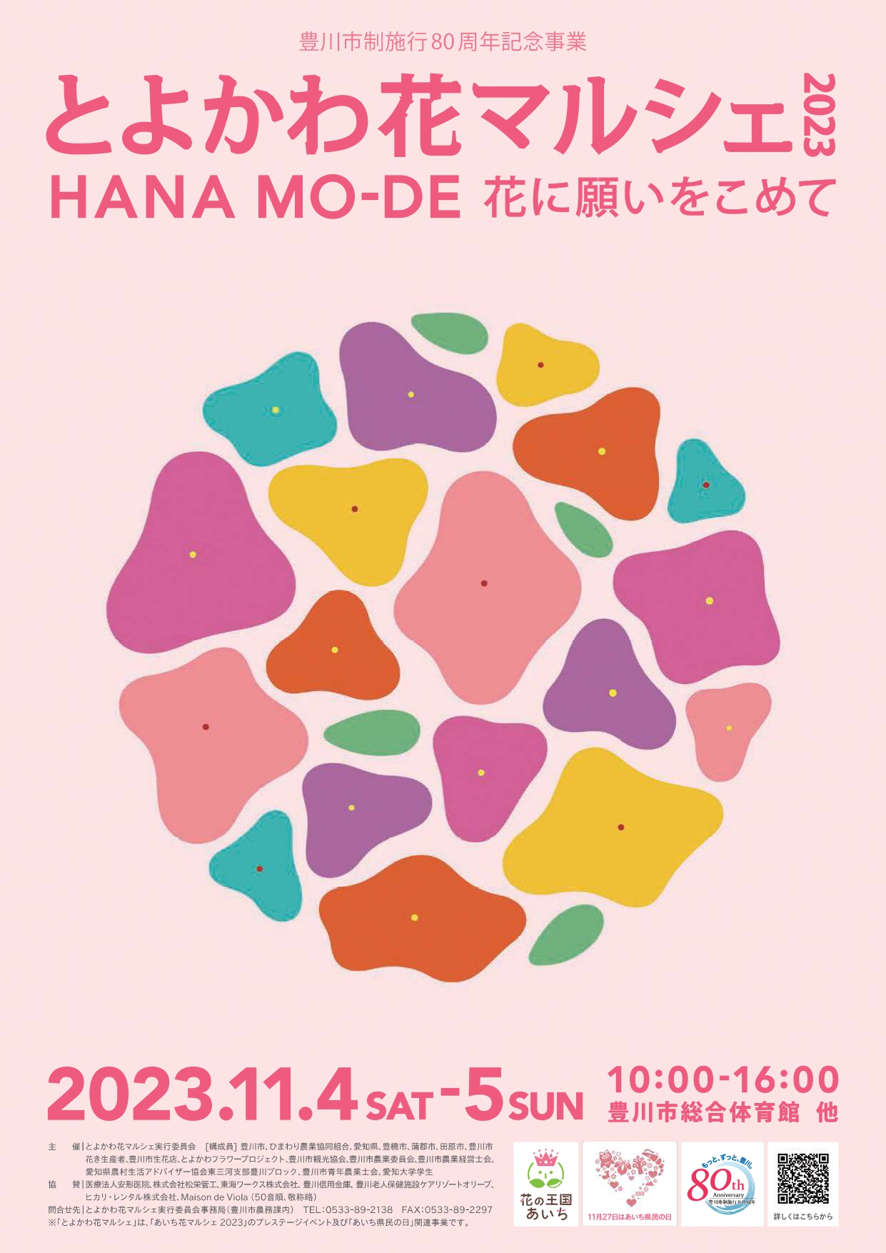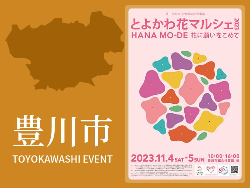 2023年度に市制施行80周年を迎える本市の記念事業の一つとして、また、愛知県の素晴らしい花を「見て」、「触れて」、「購入できる」県民型のイベント「あいち花マルシェ2023」のプレステージとして、豊川産花きの魅力や花き産地としての東三河地域の魅力が満載のイベントを開催します。