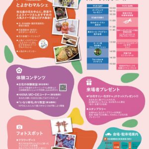 花き販売、農産物販売、花関連の雑貨等販売、花関連のワークショップ、花関連のキッチンカーなど、とよかわフラワープロジェクト、事務局屋外本部(スタンプラリースポット、花の体験講座当日受付、80歳の方及びお花のアイテムを身に着けてくれた方へのプレゼント(お花すくい、花ガチャチケット))