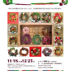 木のつるや麦わらで作ったリースに、木の実や貝殻などを貼り付けてつくります。