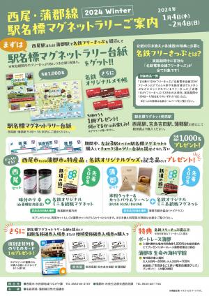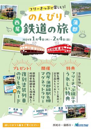 | 駅名標マグネットラリー台紙の入手方法 | 西尾駅または蒲郡駅で、名鉄フリーきっぷを提示 ※実施期間中有効な名鉄電車全線乗り放題フリーきっぷ全てが対象 |
