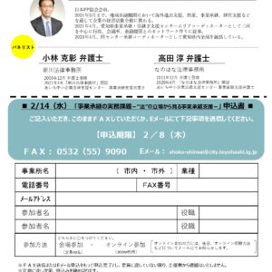 本セミナー終了後、セミナー会場では、豊橋市役所で開催する事業承継個別相談会の申込受付をいたしますので、ご希望の方はお申込みください。(個別相談会は随時、申込みが可能です。)