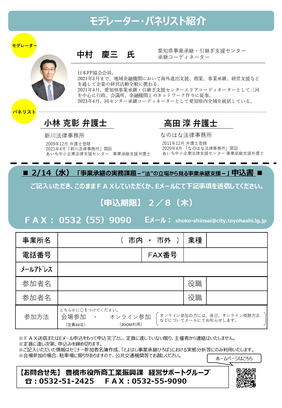 本セミナー終了後、セミナー会場では、豊橋市役所で開催する事業承継個別相談会の申込受付をいたしますので、ご希望の方はお申込みください。(個別相談会は随時、申込みが可能です。)