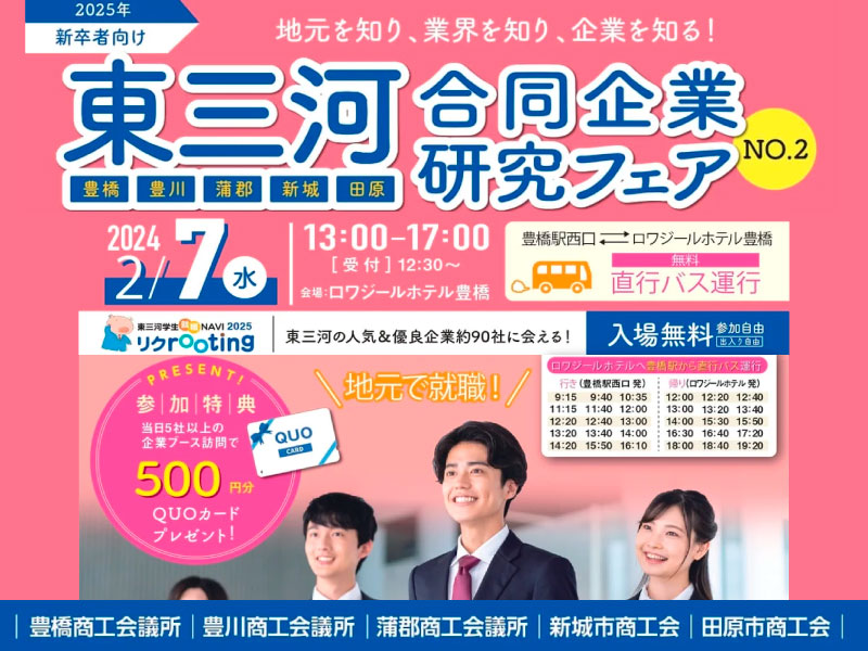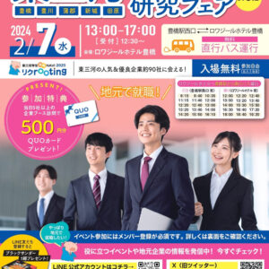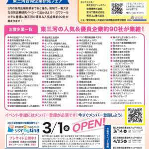 3月の採用広報解禁まであと僅か。地域で一番大きな合同企業研究イベントに出かけよう! ロワジールホテル豊橋に東三河の優良&人気企業約90社が集まります!本気の1社に出合うためにもあらかじめ出展企業をチェックして一気にまわろう!