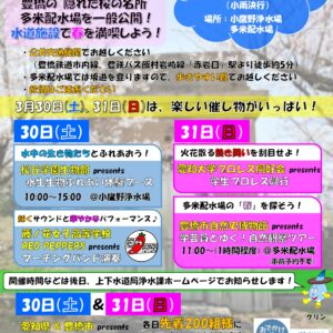 昨年に引き続き、多米配水場を一般公開するとともに、3月30日(土)、31日(日)は、地域で活躍する学生の方々や愛知県とのコラボ企画など、様々な催し物を予定しています!