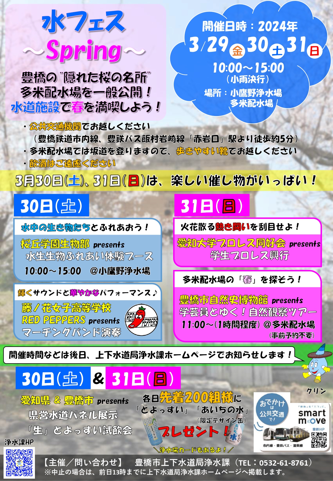 昨年に引き続き、多米配水場を一般公開するとともに、3月30日(土)、31日(日)は、地域で活躍する学生の方々や愛知県とのコラボ企画など、様々な催し物を予定しています!