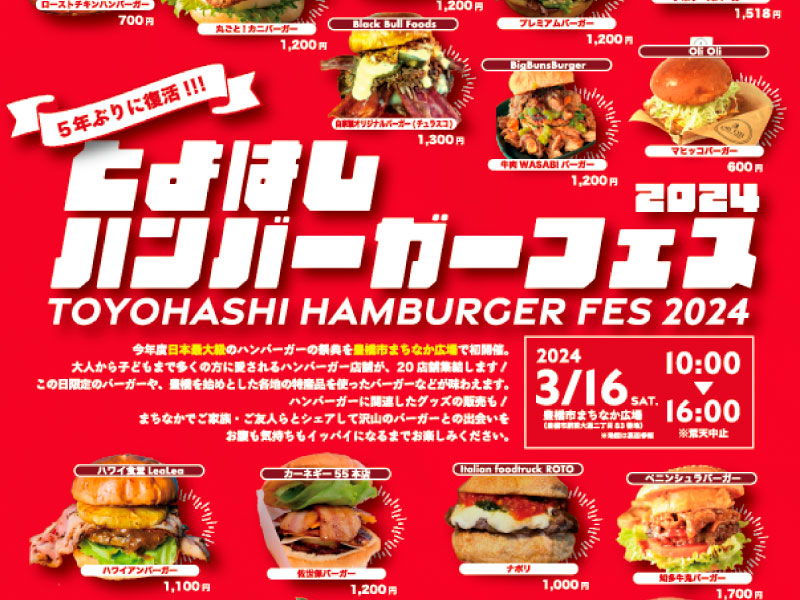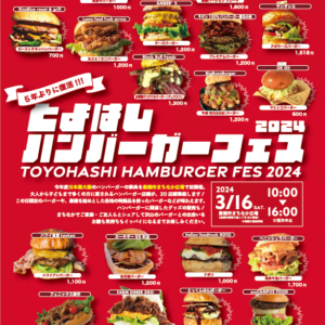 今年度日本最大級のハンバーガーの祭典を豊橋市まちなか広場で初開催します。大人から子供まで多くの方に愛されるハンバーガー店舗が20店集結し、この日限定のバーガーや豊橋を始め各地の特産品を使ったバーガー等を味わえます。また、ハンバーガーに関連したグッズの販売なども行います。