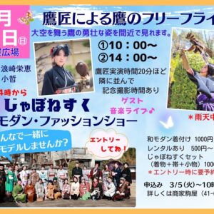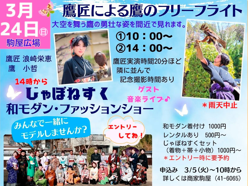 大空を舞う鷹の勇壮な姿を間近で見られます。14時からはじゃぽねすく和モダン・ファッションショーを開催。みんなで一緒にモデルしませんか?