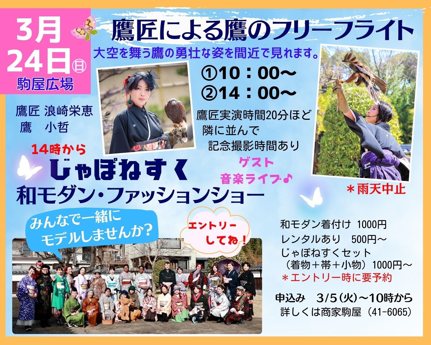 大空を舞う鷹の勇壮な姿を間近で見られます。14時からはじゃぽねすく和モダン・ファッションショーを開催。みんなで一緒にモデルしませんか?