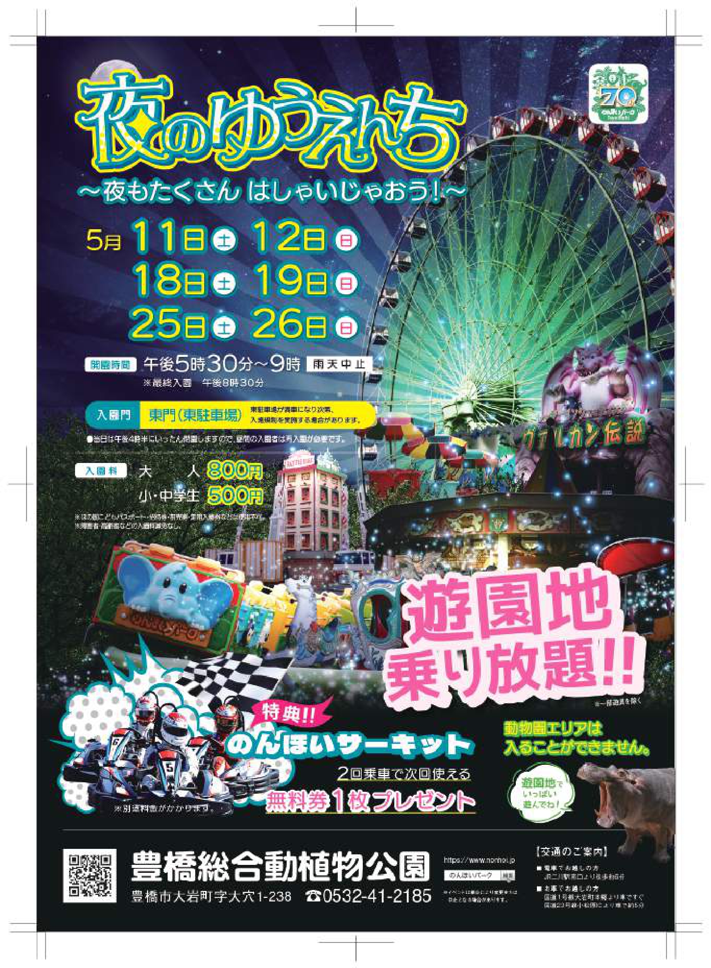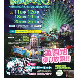 5月の第2週以降、土日の夜に遊園地エリアの遊具が乗り放題の『夜のゆうえんち』を開催いたします。