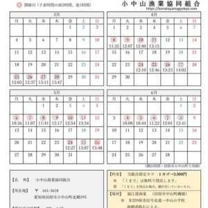 小中山漁業協同組合 (9:00~16:00まで) TEL:0531-32-0219(平日) 070-2225-8256(土日祝) ※土日祝は、潮干狩り開催中のみ通話可。 (土・日・祝日は電話応対不可) |
