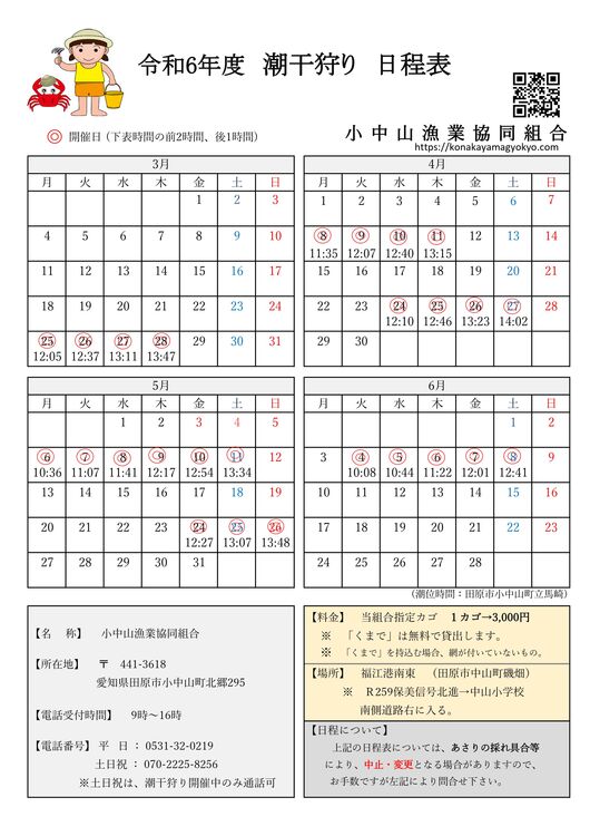 小中山漁業協同組合 (9:00~16:00まで) TEL:0531-32-0219(平日) 070-2225-8256(土日祝) ※土日祝は、潮干狩り開催中のみ通話可。 (土・日・祝日は電話応対不可) |