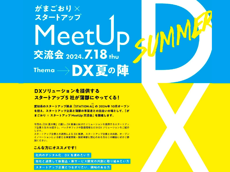 蒲郡商工会議所にて、「社内のデジタル化、DXを進めたい方」「他社と連携して新製品・新サービス開発の共創に取り組みたい方」「スタートアップ企業とつながりたい、興味のある方」などを対象に、「がまごおりxスタートアップ MeetUp 交流会」が開催されます。