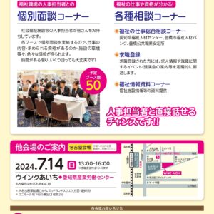 愛知県内の福祉事業所がブースを構え、求人情報の提供、人事担当者との個別面談など、福祉の仕事についての相談会を実施します。福祉の仕事が初めての方でも大丈夫です。安心してご参加ください。
